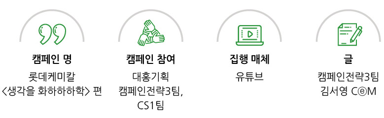 그렇다면 여기 호탕한 웃음소리로 가득한 롯데케미칼의 브랜디드 컨텐츠 <생각을 화하하하학> 편을 확인해보세요. 시종일관 웃음이 이어지는 영상을 보면, 오늘 하루를 마무리하는 침대에서 입가에 슬며시 웃음이 번지리라 장담합니다.