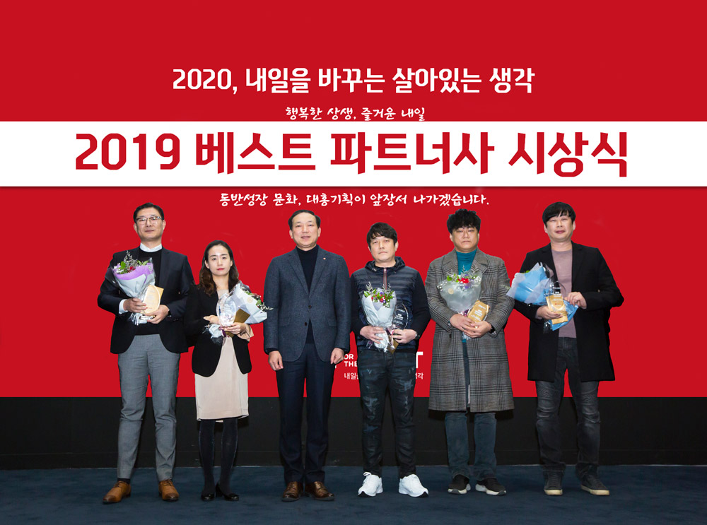 대홍기획은 파트너사와의 동반성장 문화 정착을 위해 2018년부터 <베스트 파트너사 시상식>을 실시하고 있습니다. 한 해 동안 대홍기획과 호흡을 맞춘 파트너사에 고마움을 전하고 더 나은 파트너십을 구축한다는 의미를 담고 있죠. 올해에는 ㈜슈퍼마켓크리에이티브, ㈜오스카스튜디오, ㈜블루인마케팅서비스, ㈜에이번, ㈜로보트필름을 그 주인공으로 선정했습니다.
