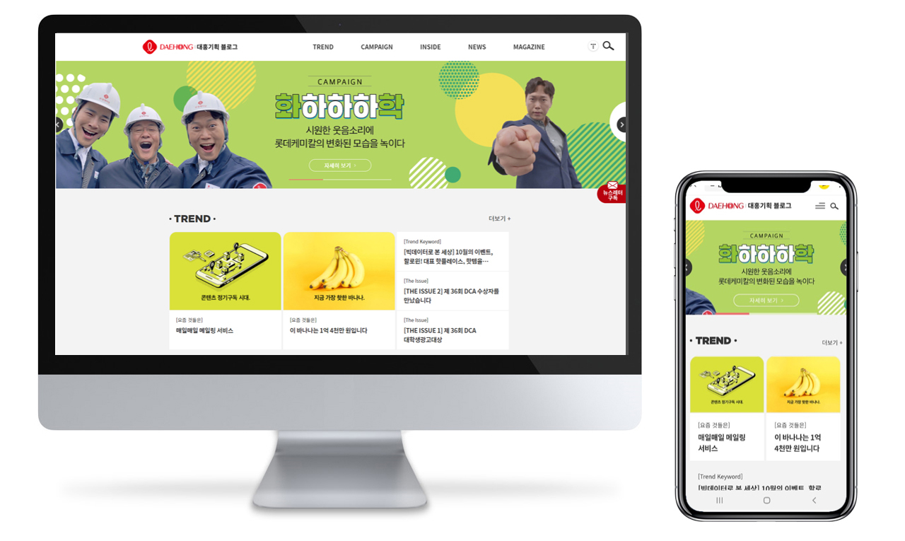 대홍기획이 공식 홈페이지와 블로그를 리뉴얼 오픈했습니다. 레전드 히트 캠페인부터 최신 포트폴리오, 디지털 매거진, 뉴스 등 대홍의 L!VE한 콘텐츠를 이제 PC와 모바일로 만나볼 수 있습니다. 대홍기획 블로그에서 이메일 및 모바일 뉴스레터를 신청하면 매월 최신 콘텐츠를 받아볼 수 있으니 많은 관심과 구독 부탁드립니다.