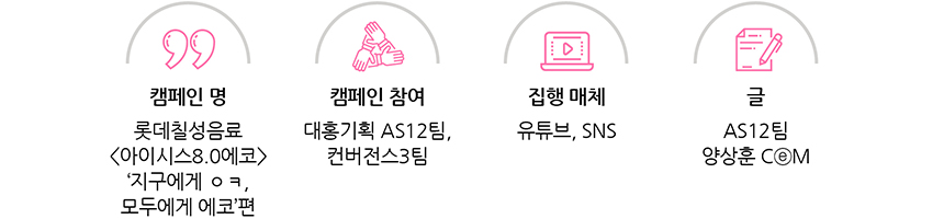 아이시스8.0에코 광고는 소비자와의 공감, 재미있는 크리에이티브 요소로 유튜브 공개 한 달 만에 조회 수 400만을 훌쩍 넘겼습니다. 이는 광고의 영향도 있지만, 친환경 제품에 대한 사회적 관심과 브랜드의 진정성이 느껴지는 제품 자체의 영향도 컸다고 생각합니다. 이제 필환경 시대입니다. 지금 이 글을 읽고 계신 분 중에도 친환경에 관심은 많지만 실천까지는 쉽지 않았던 분이 계시겠지요? 그렇다면 지금 바로 칠성몰에서 아이시스8.0에코를 만나보시길 강력히 추천합니다.