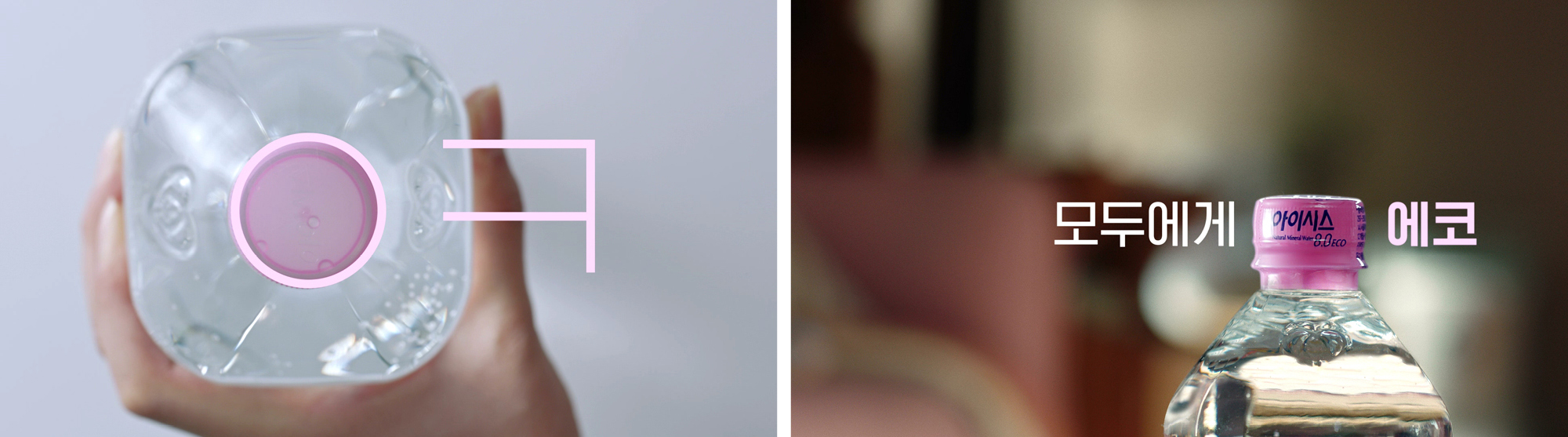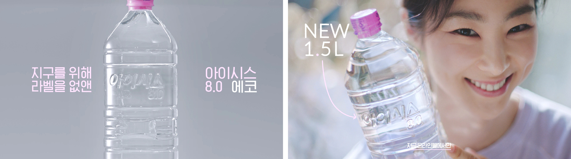‘아이시스8.0에코’는 필환경 시대에 발맞춰 출시한 국내 최초 무라벨 제품입니다. 분리수거 시 제거해야 하는 라벨 자체를 아예 없애 버림으로써 플라스틱 재활용률을 높이는 친환경 생수죠. 브랜드의 얼굴과 같은 라벨을 없앤다는 것은 그 자체만으로도 혁신이었고, 다른 브랜드에서는 아직 시도조차 하지 않은 선제적 움직임이었습니다.