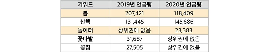 예년 같으면 날씨가 풀리고 봄꽃이 피면서 한창 나들이를 다녀야 할 시기인데, 집에만 있다 보니 시간 가는 줄 모르겠다는 사람이 많다. ‘드라이브-스루 벚꽃놀이’ 등 갖은 방법으로 봄을 안전하게 즐기려는 시도가 나타나고 있지만, 2020년 봄은 아무래도 잔인한 공백의 기억으로 남을 듯하다. 이를 입증하듯 2019년 1분기 ‘일상+봄’의 언급량은 207,421건에서 2020년 118,409건으로 약 43% 급감했다.