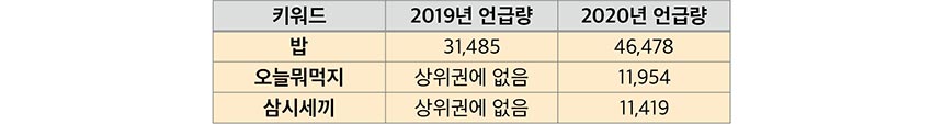 재택근무와 온라인 개학 등 ‘집콕’ 생활이 이어지며 그야말로 먹는 게 큰 고민이 됐다. 연관어 ‘밥’의 언급 빈도가 2019년(31,485건) 대비 2020년(46,478건)에 약 48% 증가했고, 2019년에는 ‘일상’ 연관어 상위권에 없었던 ‘오늘뭐먹지’(2020년 11,954건), ‘삼시세끼’(2020년 11,419건) 등이 상위에 떠오르는 결과로 나타났다. 메뉴 선정과 재료 구입, 손질, 준비의 수고를 덜어주는 제품 및 서비스의 약진이 확인되는 대목이다.