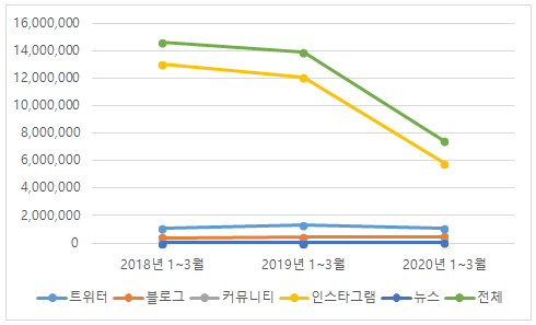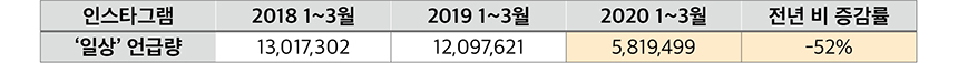 특히 평범하고 개인적인 일상의 단면을 기록하고 공유하는데 주로 사용되는 소셜미디어인 인스타그램에서 ‘일상’ 언급량의 감소 폭은 더 컸다. 2019년 1분기 1,210만여 건에 달했지만, 2020년 1분기에는 582만여 건으로 52% 감소했다. 이와 같은 급격한 감소는 코로나 사태 발생 이후 사회적 거리두기 실천으로 지인과 공유하고 싶은 ‘소소하지만 특별한’ 일상사가 좀처럼 생기지 않은 탓으로 풀이된다.