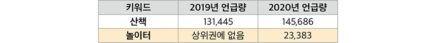 연중 가장 날씨가 좋은 시기, 여행과 나들이가 금지된 일상 속에서 소소하지만 특별하게 떠오른 장소는 바로 놀이터였다. 2019년 ‘일상’ 연관어 상위권에 없었던 ‘놀이터’는 2020년 23,383건의 언급량을 기록하며 상위권에 떠올랐다. 집 앞 작은 놀이터에 나가는 것마저 기록할만한 특별한 일상이 된 것이다.