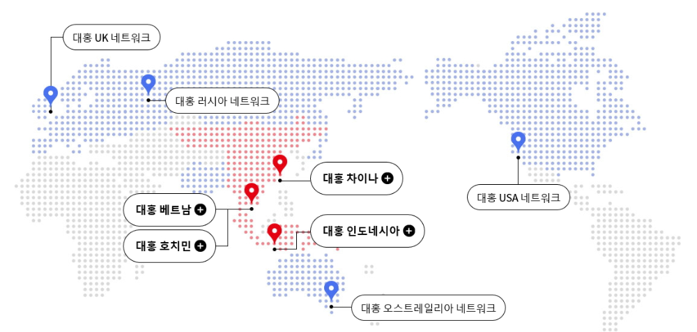 대홍기획은 현재 베트남에 하노이법인과 호치민 사무소를, 인도네시아 자카르타, 중국 상해에 각각 법인을 두고 있습니다. 베트남법인은 베트남 1위 프랜차이즈인 롯데리아를 비롯해 롯데마트, 롯데백화점, 롯데컬처웍스(시네마), 롯데호텔, 롯데자산개발 등 베트남 현지 법인 캠페인 업무를 진행합니다.