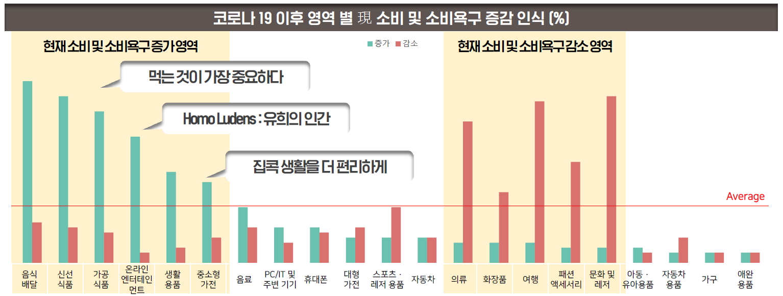 코로나19로 인해 현재 소비 혹은 소비 욕구가 증가한 영역과 감소한 영역에 대한 응답 결과를 보면, 소비자들이 현재 필수적이라고 생각하는 영역과 그렇지 않은 영역이 확연히 구분된다. 현재 소비 혹은 소비 욕구가 증가하는 업종은 먹는 것, 온라인으로 즐기는 것, 집 안의 생활을 편리하게 해주는 것과 연관이 있다.
