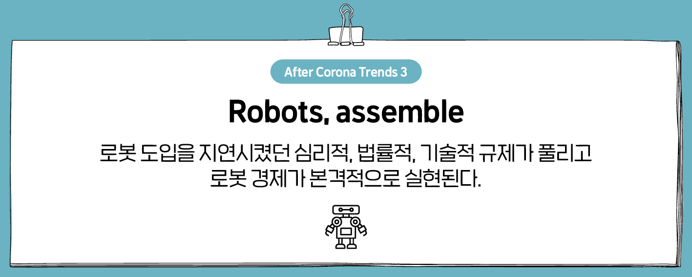 로봇의 도입, 자율주행차 등은 상용화를 검토하며 지속 논의돼온 기술이었으나, 코로나19로 인한 비대면 동기 강화 국면에서 본격적으로 활용할 계기를 맞게 된 것으로 보인다. ‘우아한형제들’은 2019년 7월, 푸드테크 기술이 접목된 미래식당 ‘메리고키친’을 선보였다. 이곳에서는 QR코드로 음식을 주문하고 배달의민족 앱으로 결제하면 자율주행 로봇(PuduBot, vd company)이 음식을 서빙한다. 서빙로봇 딜리(dilly)의 렌탈 서비스도 시작했다.