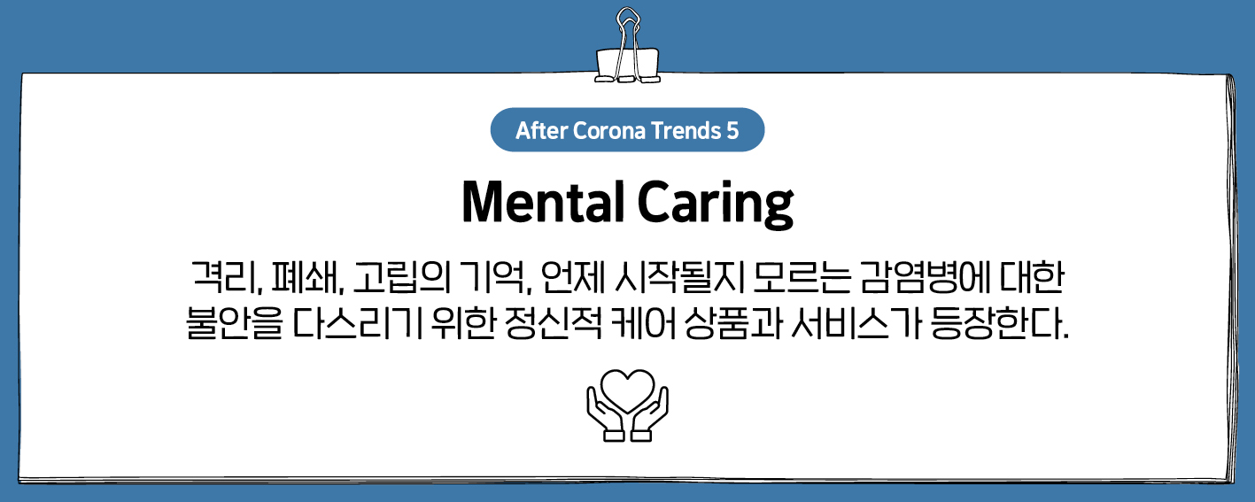 국내 스타트업 아토머스가 제공하는 ‘마인드카페’는 온라인으로 공인 자격 심리전문가를 연결해주는 익명 보장 모바일 마음치유 서비스다. 또한 미국에서는 챗봇의 고독 검진을 통해 고립과 고독을 파악하고, 사용자의 정신건강 상태를 체크해 도움을 줘야 하는 시점을 콜센터 직원에게 알려주는 서비스인 픽스 헬스(Pyx Health)가 등장했다.