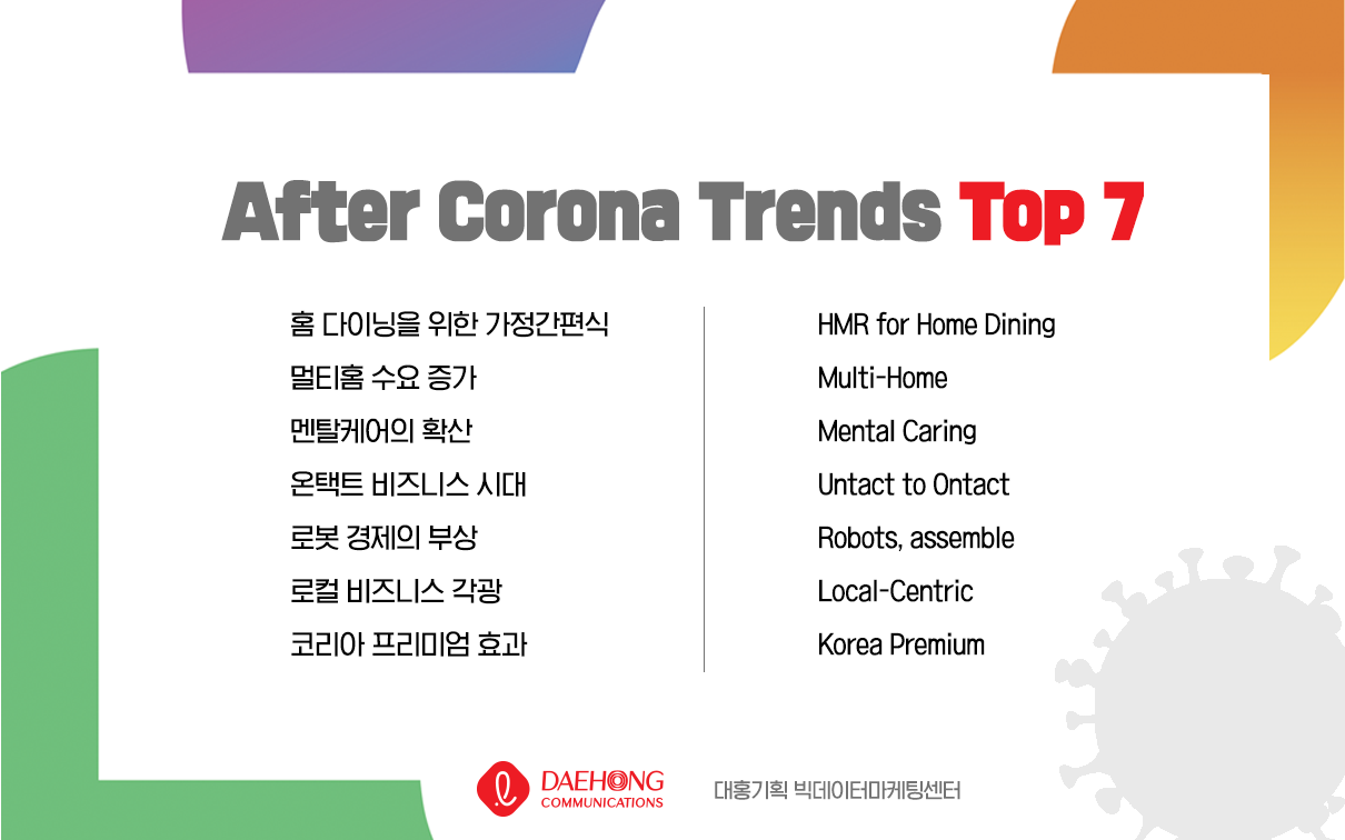 * 대홍기획 빅데이터마케팅센터에서는 코로나19로 인한 우리의 일상과 소비의 주요한 변화상을 살펴보고, 코로나 이후까지 지속될 주요 트렌드를 짚어보며, 마지막으로 포스트 코로나 시대 대비를 위한 기업과 브랜드의 대응 사례 및 적용 방향을 조망해 보는 ‘코로나19, 뉴노멀의 시작’ 3부작 트렌드 리포트를 기획, 발행 중이다. 본 고는 그중 2호에 해당하는 ‘Corona Impacts: 변화의 방향 - After Corona Trends Top 7’의 내용을 담고 있다.