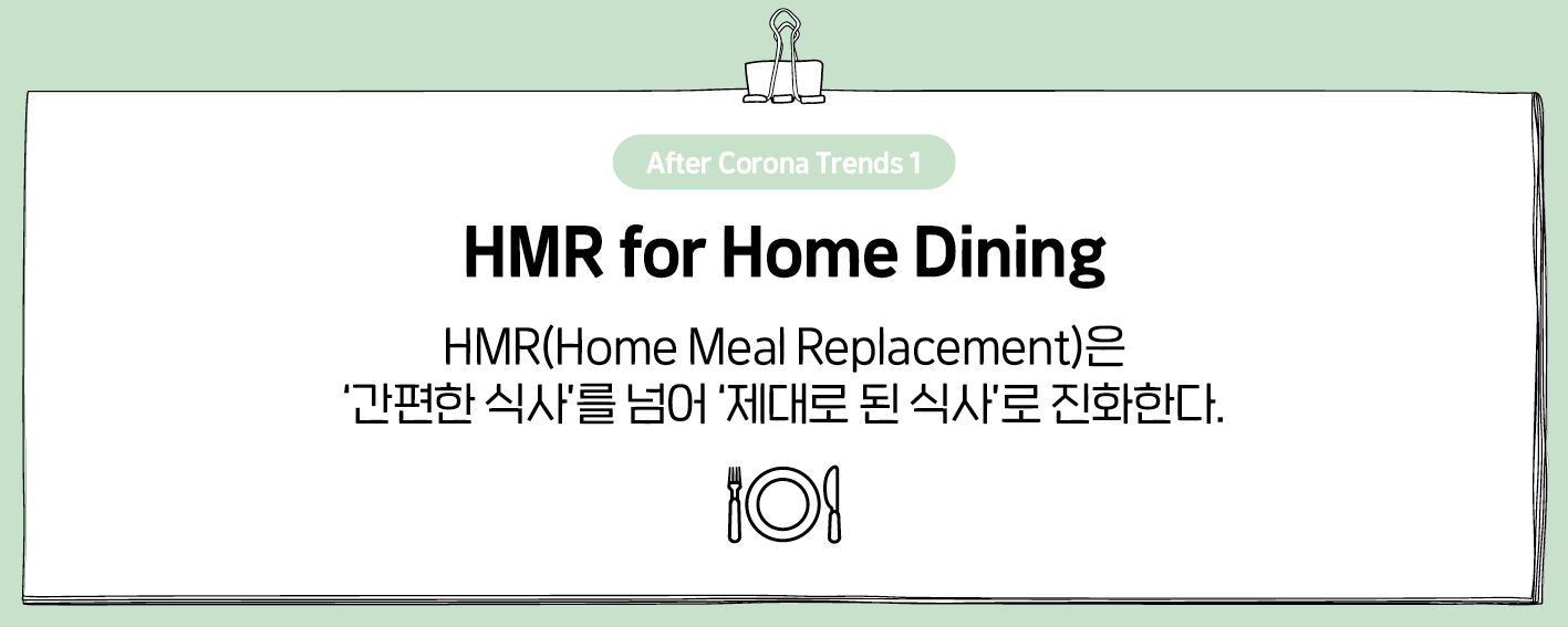 그런데 코로나19로 촉발된 재택과 집콕 속에 자의 반 타의 반 집밥이 필수가 됐고, 누구나 하루 N끼를 직접 차려 먹거나 먹여야 하는 도전에 직면하게 됐다. 그래서 앞으로 HMR의 방점은 ‘제대로 된’ 식사에 찍혀야 한다. 즉, HMR은 더 이상 1인 가구나 영 타깃을 위한 ‘간편한 대용식’에 머무르지 않을 것이다. 가족을 위해 프리미엄 재료를 사용해 단순히 한 끼 식사를 때우는 수준을 넘어, 훌륭한 식탁을 손쉽게 차리기 위한 수단이 될 것으로 보인다.
