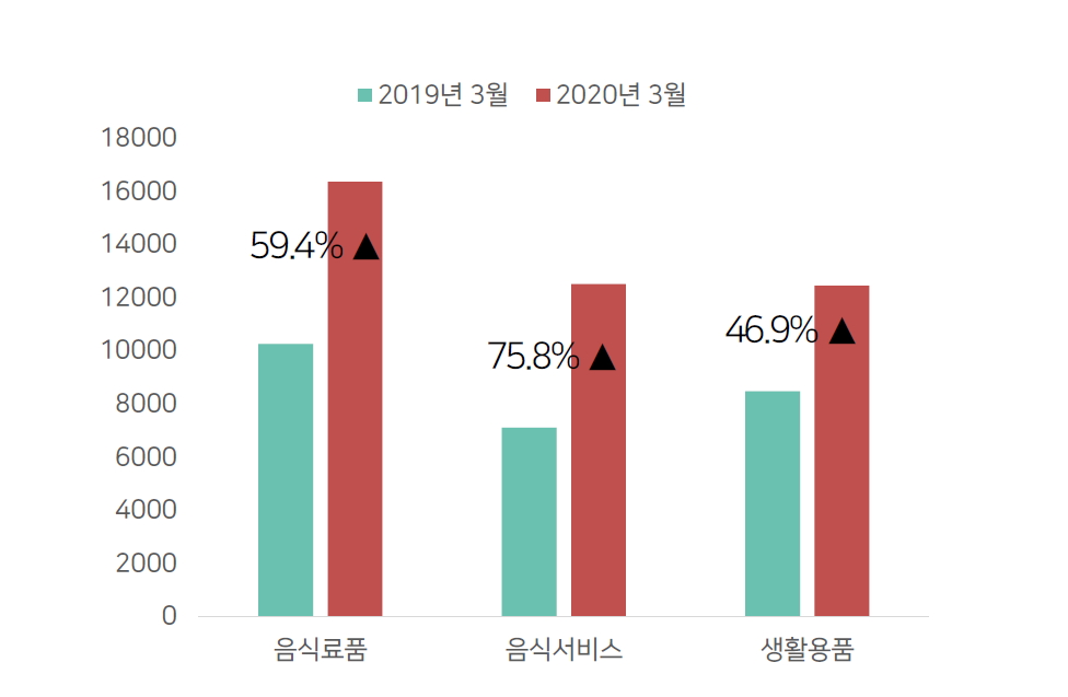 이미 메가 트렌드가 되어 가고 있던 비대면, 일명 언택트 트렌드는 코로나 發 위기로 절박한 동기가 추가되며 가속화되기 시작했다. 통계청에 따르면 2020년 3월 기준 온라인쇼핑 거래액은 2019년 동월 대비 카테고리별 50~75%가량 폭발적 성장을 기록했다.