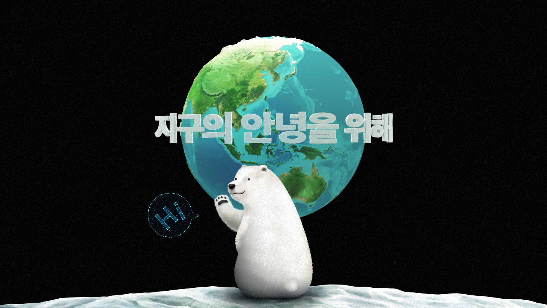 광고의 도입은 흰색 화면이 검은색 화면으로 전환되며 절전모드를 알립니다. 광고주의 요청에 따라 ‘이제는 정말 실천해야 할 때’를 알리는 그레타 툰베리의 ‘It`s time to Act’가 나타났다 사라집니다. <Hi !nnovation>의 Hi를 담은 구체가 SK이노베이션의 친환경 사업 실체 이미지에 부딪힙니다. 마지막에는 ‘지구의 안녕을 위해’라는 캠페인 슬로건과 함께 북극곰이 하이이노베이션의 하이를 외친 후 마무리됩니다. 처음 이 시안을 보았을 때 제3세계 광고스러운 신선한 느낌이 들었습니다.