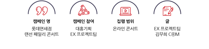 연간 프로젝트인 롯데면세점 패밀리 콘서트의 31회 준비는 벌써 시작됐습니다. 코로나가 지속될 것으로 보고 단계별 접근 전략부터 고객의 트렌드 스타일과 K-컨텐츠까지 아우를 수 있도록 장르의 확대 방안도 고민 중입니다. 이렇듯 패밀리 콘서트가 해를 거듭할수록 변화된 모습으로 글로벌 트렌드를 선도하는 K-플랫폼으로 확장되기를 기대합니다.