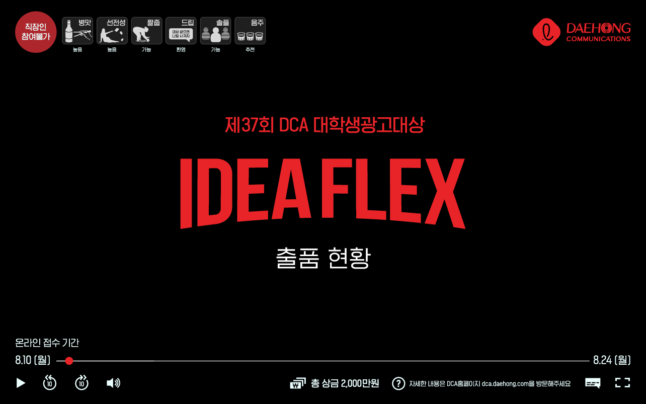 참신한 아이디어와 창의력, 광고의 핵심이라 해도 과언이 아닙니다. 그러나 이러한 크리에이티브도 거듭된 노력과 훈련을 거쳐야 단단하고 완성도가 높아지죠. 그래서 시작된 <DCA(Daehong Creative Awards) 대학생광고대상>. 예비 광고인인 대학생이 광고 실무에 한발 다가가고, 이를 통해 광고산업 발전에 기여하는 대홍기획 축제의 현장, 올해엔 어떤 모습이었는지 확인해보세요.