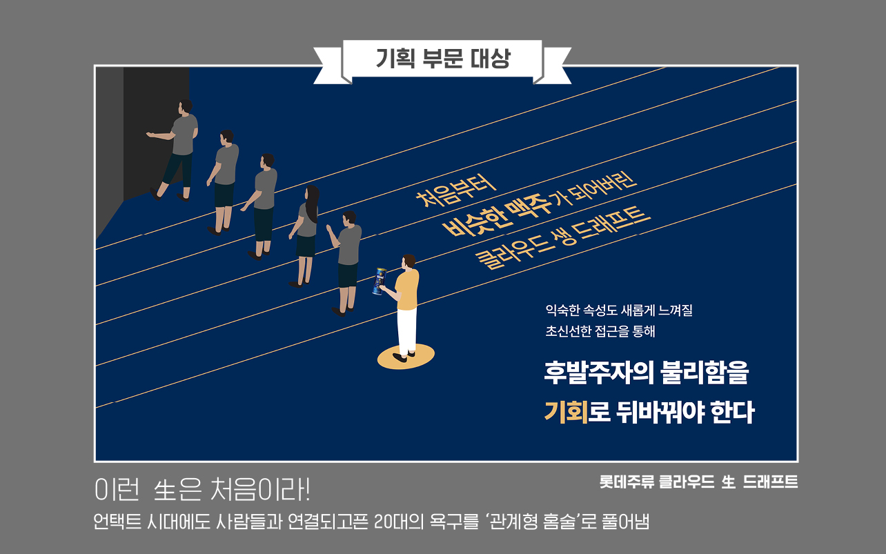 기획서 부문 대상인 ‘이런 生은 처음이라!’는 언택트 시대의 홈술과 사람과의 연결을 참신한 아이디어로 다뤄 제품의 특징, 타깃 오디언스, 동시대 감성을 잘 녹였습니다. ‘내 사이, 다 돌려줘요!’는 대학생다운 문제의식과 재치가 돋보였으며, ‘트렌드를 선도하는 멕시카나’는 기성세대와 신세대의 공감을 유머러스하게 잘 표현했습니다.