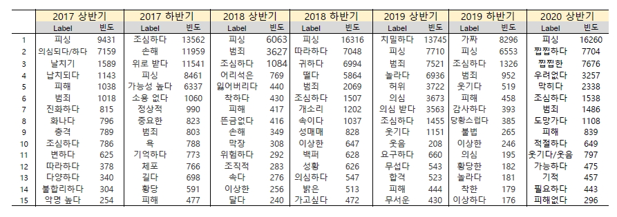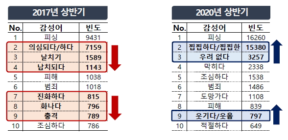 이에 보이스피싱에 대한 관심도가 하락하는 원인은 사람들의 태도변화에 기인할 수 있다는 가설을 세우게 됐다. 실제로 2017년부터 2020년까지 반기별로 보이스피싱에 대한 감성어를 살펴보면, 2017년 상반기에는 주로 불안감에 대한 키워드가 상위권을 차지한다. 가령 ‘의심되다/하다, 날치기, 납치되다, 진화하다, 화나다, 충격’ 등의 키워드가 10위권 내에 있다. 그러나 2020년 상반기가 되면 2017년에 있던 감성어는 순위권 밖으로 밀려나고 대신 ‘찝찝하다/찝찝한, 우려 없다, 웃기다/웃음’ 등의 감성어가 올라오는 것을 볼 수 있다. 이는 사람들이 보이스피싱의 기관사칭과 대출사기 유형을 반복해 접함에 따라 더 이상 새롭지 않은 ‘일상화된 경험’이 됐으며, 웃음 소재로 삼는 등 방심의 태도가 만연함을 의미한다. 즉 범죄의 자극에 점차 무뎌지는 것이다.
