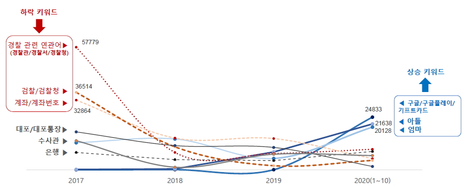 보이스피싱에 대한 관심도가 떨어지는 이유를 살펴보기 위해 그 관심도를 구성하는 여론을 확인했다. ‘보이스피싱’ 연관어 추이를 살펴보면 2017년 기관 사칭을 대표하는 주요 키워드인 ‘경찰/검찰’ 연관어가 지속적으로 하락했다. 반면, 새로이 기승을 부리는 가족 사칭/구글 기프트카드 관련 연관어는 많아지는 것을 확인할 수 있다. 물론 신종 수법에 대한 경각심이 높아지는 것은 긍정적인 반응이라고 볼 수 있다. 그러나 여전히 다수의 피해가 기관 사칭과 대출 사기에 기인한다는 점을 고려하면, 기존 수법에 대한 관심도가 지속 하락하는 것은 문제로 볼 수 있다.