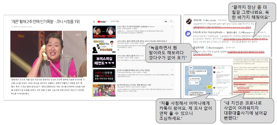 이 중에서 가장 많이 소비되는 건 무엇일까? 보이스피싱 컨텐츠를 살펴보기 위해 유튜브와 SNS 등 인터넷상의 인기 게시글과 컨텐츠를 살펴봤다. 경고성 글보다는 유머 소비형 글이 다수 올라오는 것을 볼 수 있었다. 한때 인기를 끈 개그콘서트의 코너를 비롯해 유튜브에서는 보이스피싱범을 어떻게 혼내주거나 조롱했는지에 대한 컨텐츠가 상위권을 차지하고 있다. 또 커뮤니티 상에서 회자되는 글은 주로 보이스피싱범의 실수담을 포함해 유머 소재로 활용되는 내용이 주를 이뤘다.