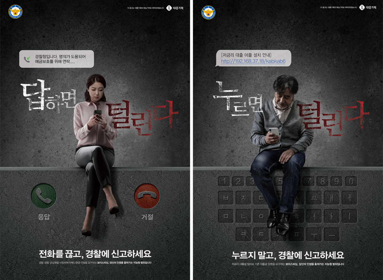 한편 시각적으로는 무거운 경고의 메시지가 톤앤매너에서부터 느껴지도록 하는데 중점을 뒀다. 전체적으로 어두운 톤에 강한 콘트라스트를 주어 인물의 표정을 강조해 보이스피싱의 심각성을 부각했고, 헤드카피에는 공포 영화 포스터에서 볼 수 있을 법한 그런지 효과를 주어 강력한 메시지에 힘을 더해 보이스피싱이 가벼운 범죄가 아님을 전달하고자 했다. 이렇게 완성된 포스터는 전국 경찰청과 공공기관, 온라인에 배포됐고 더 적극적인 홍보를 위해 롯데마트에도 부착할 수 있도록 지원됐다.