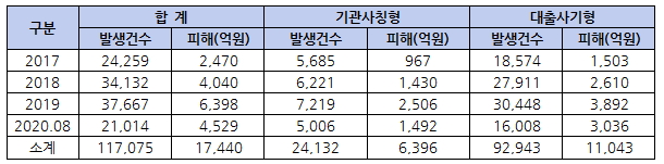 대홍기획 봉사동호회 <나눗셈>은 보이스피싱 예방을 위한 캠페인 수립을 위해 빅데이터를 활용해 인사이트를 얻고 전략을 도출했다. 보이스피싱 피해액을 살펴보면, 2017년 약 2470억원 수준이었으나 매해 약 2천억원씩 피해 규모가 늘어나 2019년에는 약 6400억원에 이른다. 특히 2030 젊은층은 기관 사칭형, 40대 이상은 은행 대출을 빙자한 대출 사기형에 취약한 것으로 드러났다.