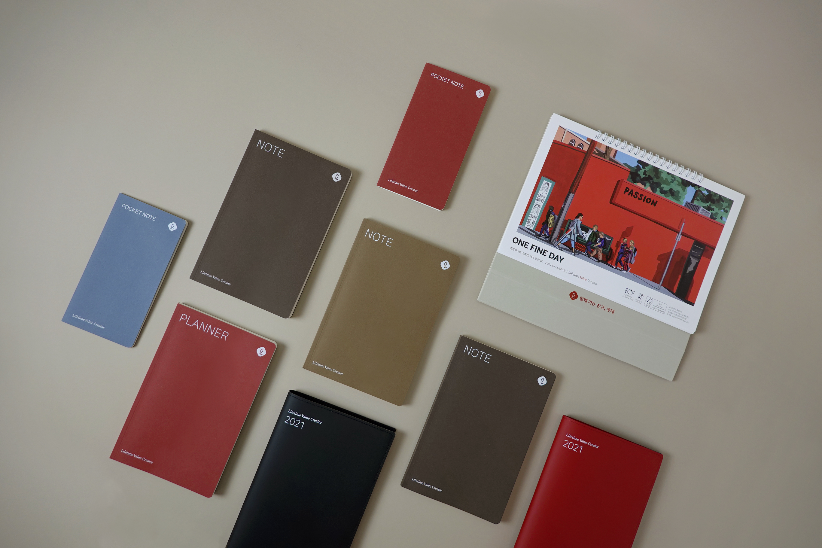 작년에는 그룹사 최초로 다이어리에 GRS(Global Recycled Standard) 국제 친환경 인증 원단을 도입해 무게와 실용성을 개선해 많은 지지를 받았습니다. 이어 올해에는 BLACK&RED 두 컬러의 원단을 사용하고 내지와 소형수첩까지 친환경 소재 사용을 확대했습니다. 다양한 식물 소재와 그린(수력) 에너지로 만든 친환경 종이 크러쉬(CRUSH)가 그 주인공입니다. PLANNER와 NOTE, 그리고 POCKET NOTE의 표지 컬러에 따라 헤이즐넛, 커피, 라벤더, 체리로 된 유기농 제품 부산물이 함유되어 환경을 고려하는 동시에 심미적 요소까지 놓치지 않았습니다.