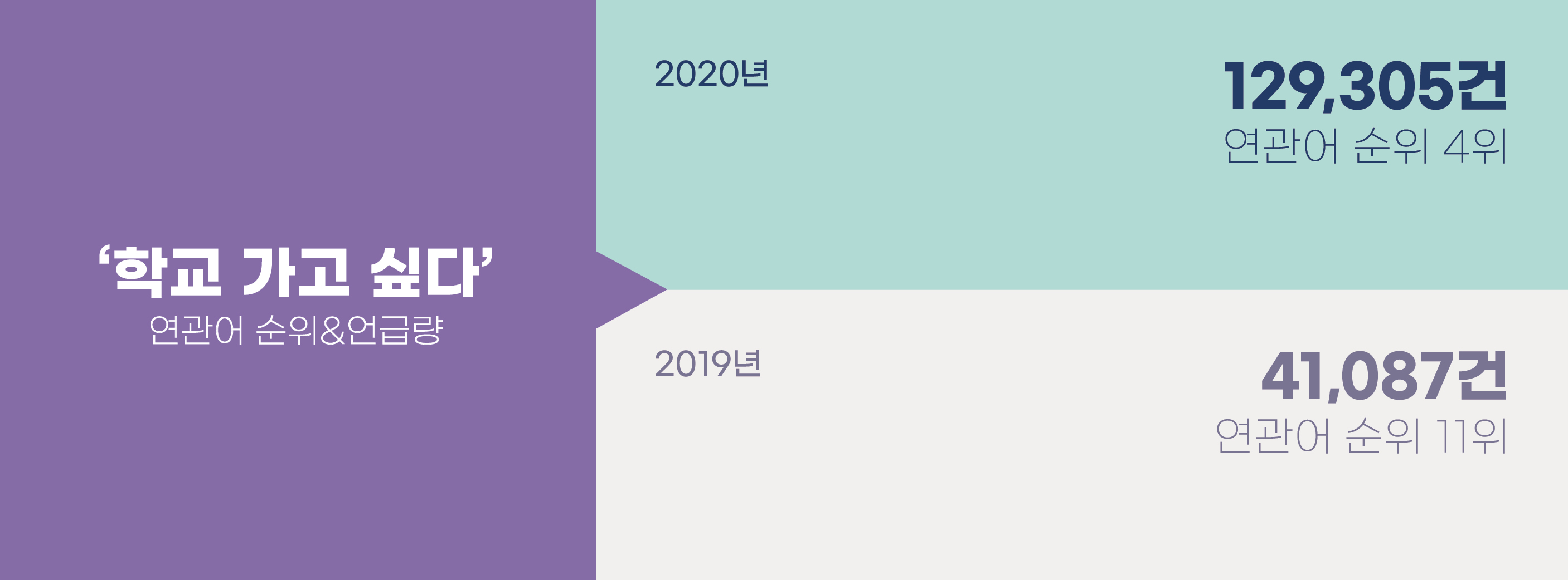 이토록 평범한 일상을 그리워한 적이 있었을까? 일상은 늘 거기에 있는 것이기에 ‘돌아가고 싶은’ 것은 아니었다. 2019년까지만 해도 우리는 막 여행을 마친 뒤 여행지로 돌아가고 싶거나, 과거의 어떤 추억 속으로 돌아가고 싶었다. 그런데 2020년에는 ‘돌아가고 싶다’의 연관어 1위가 ‘일상’으로 바뀌었다. 2019년 돌아가고 싶은 대상 1위였던 ‘여행’의 언급량이 4,522건이었던데 비해, 2020년 돌아가고 싶은 대상 1위 ‘일상’의 언급량은 14,956여 건으로 2019년 1위의 3배에 이른다. 또한 잇따른 등교 금지 속에 학교는 강한 열망의 대상이 되고 있다. ‘가고 싶다’의 연관어를 살펴봤더니 2019년 ‘학교 가고 싶다’ 언급량은 41,087건으로 11위에 불과했는데, 2020년에는 무려 129,305건으로 증가해 4위에 올랐다.