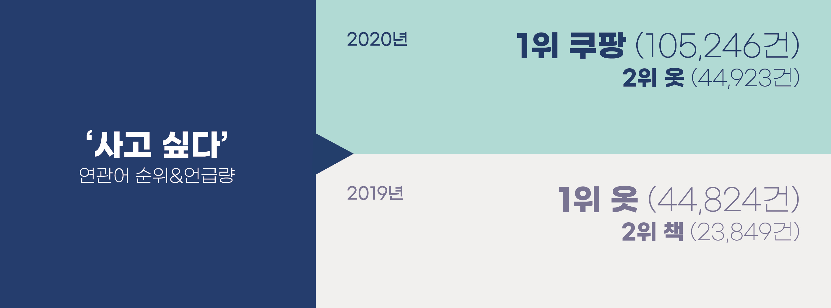 보통 가장 많이 사고 싶다고 말하는 물건은 뭘까? 2019년까지 ‘사고 싶다’의 연관어는 참으로 일관되게 ‘옷’이었다. 사고 싶다고 욕망하면서 자주 사고, 자주 생각하는 아이템으로 옷만한 것이 없을 것이다. 하지만 2020년에는 ‘사고 싶다’의 연관어 1위가 바뀌었다. 2019년 ‘옷’ 44,824건에서 2020년 ‘쿠팡’ 105,246건으로! 2위는 여전히 ‘옷’이며 44,923건으로 예년과 큰 차이가 나지 않았다. 우리의 ‘사는 것을 욕망하는’ 사고 과정 혹은 행동방식에 변화가 생긴 것이다. ‘쿠팡’이 대변하는 새로운 생활양식, 온라인 쇼핑의 보편화라는 변화다.