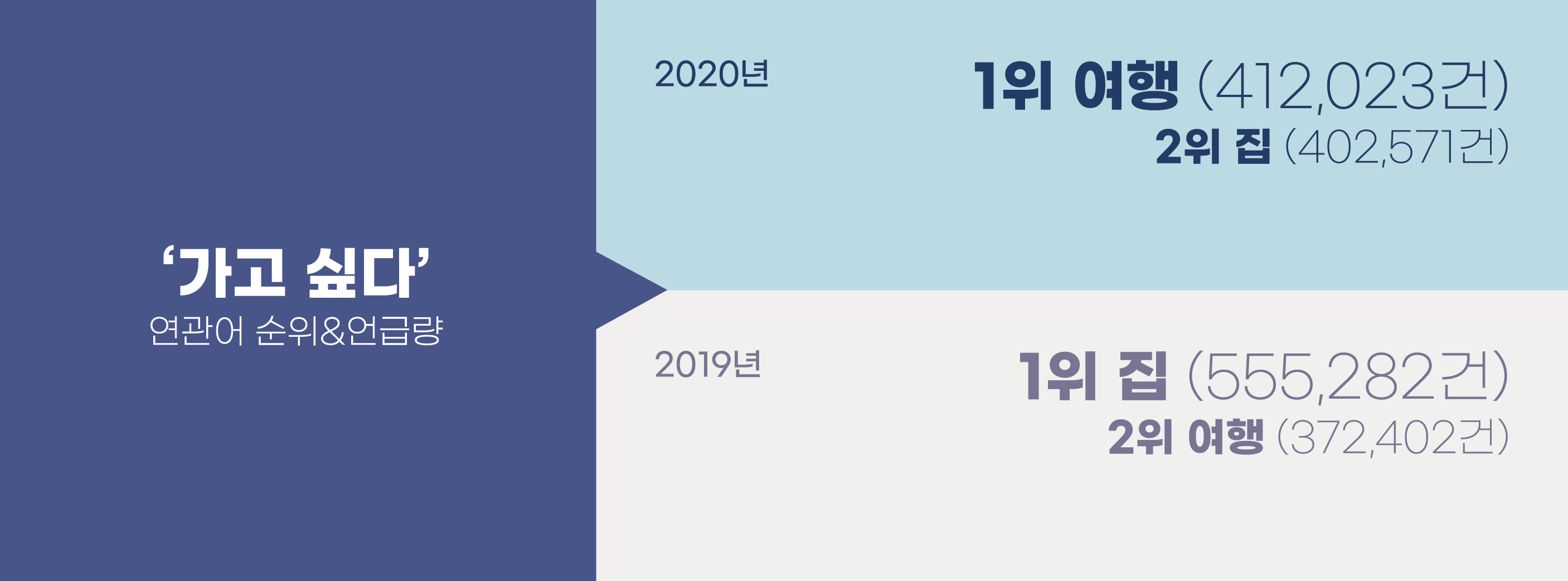 2020년 ‘가고 싶다’ 연관어 순위 4위가 학교였다면 1위는 무엇일까? 팬데믹으로 사람들이 가장 아쉬워하는 바로 그것이 1위에 올랐다. 바로 여행이다. 2019년까지 몇 년간 ‘가고 싶다’ 연관어 1위는 줄곧 ‘집’이었다. 어디서든 가장 가고 싶은 곳은 집이었던 것이다. 그런데 팬데믹은 2020년 가장 가고 싶은 곳을 여행으로 바꿔 놓았다.