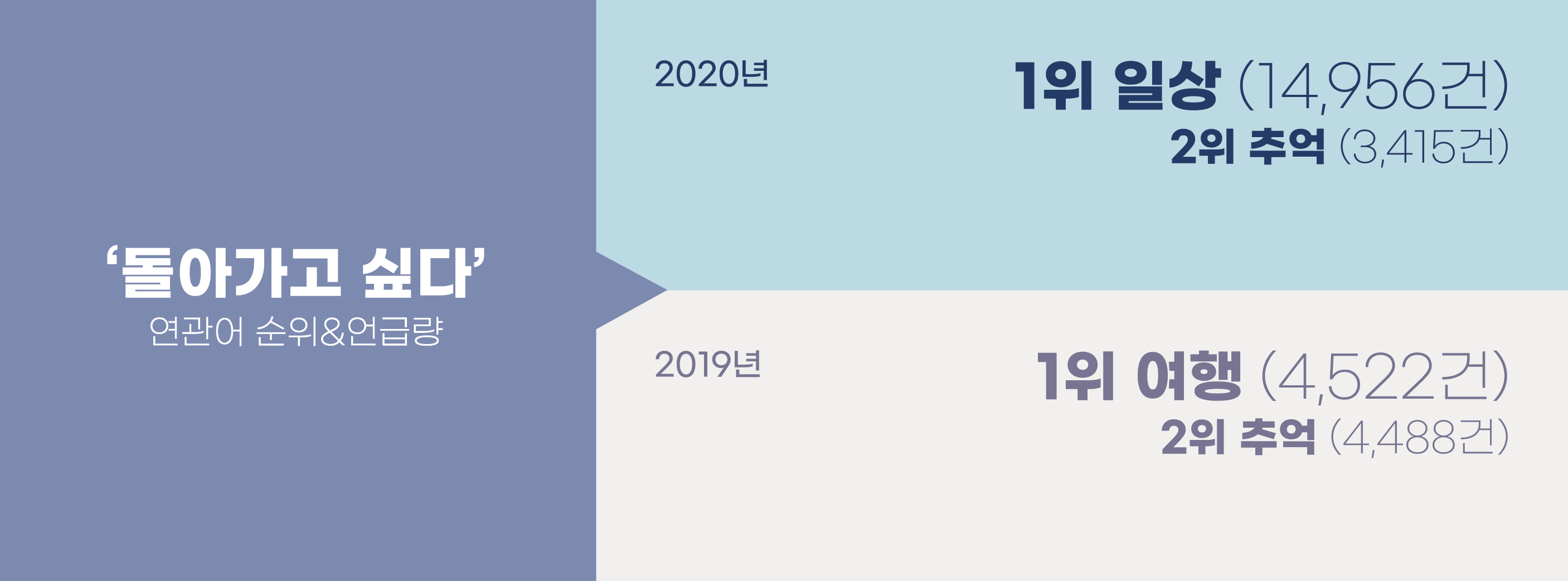 이토록 평범한 일상을 그리워한 적이 있었을까? 일상은 늘 거기에 있는 것이기에 ‘돌아가고 싶은’ 것은 아니었다. 2019년까지만 해도 우리는 막 여행을 마친 뒤 여행지로 돌아가고 싶거나, 과거의 어떤 추억 속으로 돌아가고 싶었다. 그런데 2020년에는 ‘돌아가고 싶다’의 연관어 1위가 ‘일상’으로 바뀌었다. 2019년 돌아가고 싶은 대상 1위였던 ‘여행’의 언급량이 4,522건이었던데 비해, 2020년 돌아가고 싶은 대상 1위 ‘일상’의 언급량은 14,956여 건으로 2019년 1위의 3배에 이른다. 또한 잇따른 등교 금지 속에 학교는 강한 열망의 대상이 되고 있다. ‘가고 싶다’의 연관어를 살펴봤더니 2019년 ‘학교 가고 싶다’ 언급량은 41,087건으로 11위에 불과했는데, 2020년에는 무려 129,305건으로 증가해 4위에 올랐다.