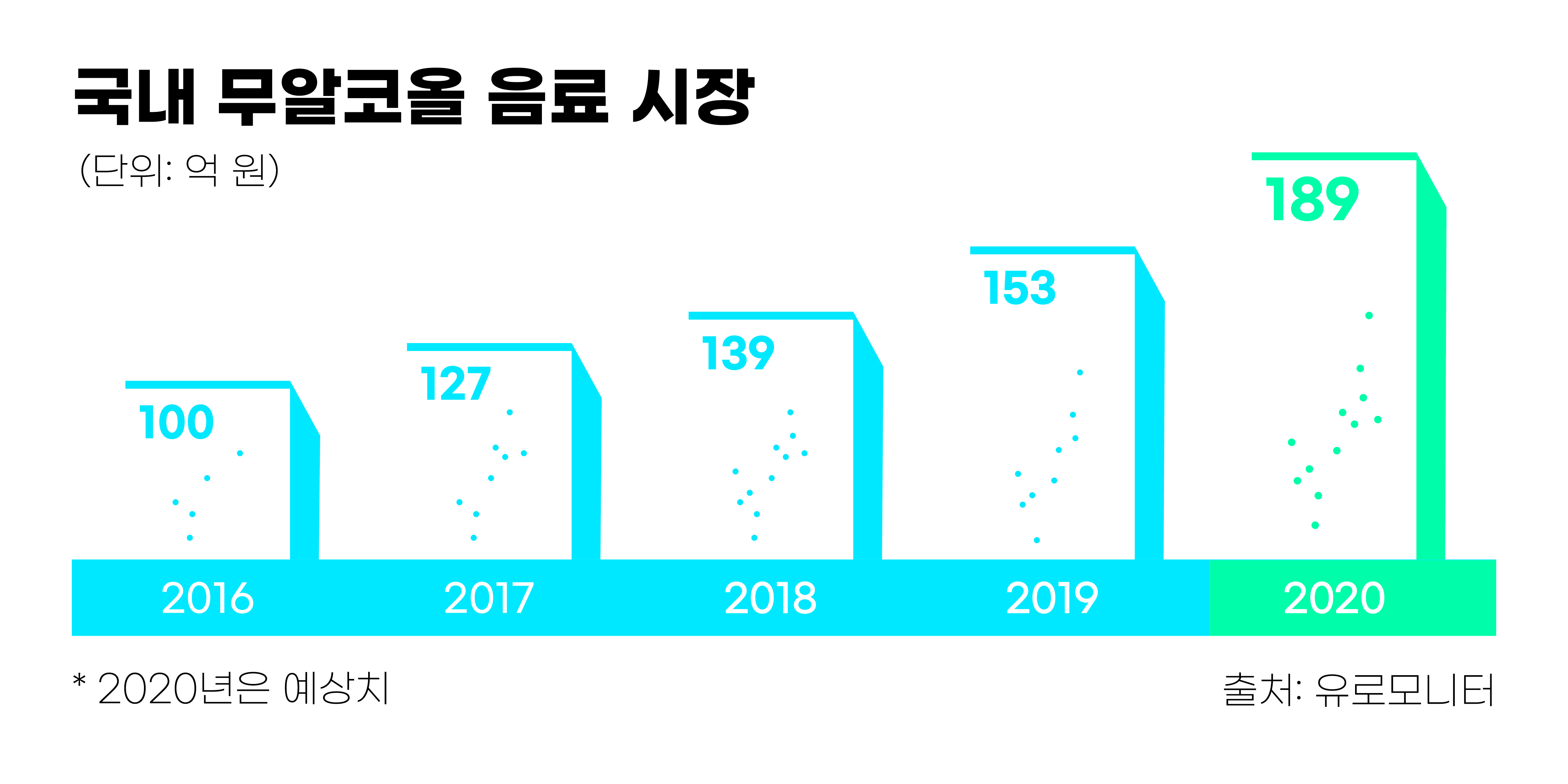프리미엄 칵테일을 판매하는 바(Bar)도 변화를 받아들이고 저알코올, 무알코올 칵테일을 개발하기 시작했다. 너무 달지 않고, 독하지 않고, 시원하고 상쾌한 칵테일이 압도적으로 사랑받으면서 ‘저도주 칵테일 운동(Low-ABV Cocktail Movement)’이라는 말까지 나왔다. 맥주 시장도 빠르게 변하고 있다. 세계 최대 맥주회사 에이비인베브(AB-Inbev)는 2025년까지 자사의 맥주 중 20%가량을 무알코올 맥주로 채우겠다고 발표한 바 있다. 버드와이저, 벡스, 칼스버그, 하이네켄의 무알코올 맥주 판매량은 갈수록 늘고, 클라우드 클리어제로, 카스 0.0 등의 국산 맥주도 판매량이 빠르게 치솟고 있다. 특히 코로나19로 인해 집에서 간단히 즐길 수 있는 음료가 각광받고, 여기에 건강을 생각하는 소비가 더해져 무알코올 맥주 판매가 특히 더 활성화될 것이라는 전망이 나오고 있다.