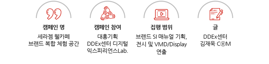 세라젬 웰카페는 의료기기 판매업과 휴게음식점이 만난 이종 산업의 융합 공간입니다. 새로운 브랜드 공간 개념의 시도는 실행 단계에서부터 여러 어려움이 있었습니다. 시도별 지자체에 따라 의료기기 유통 및 휴게음식점에 관련한 법적인 사항이 달랐고, 임대매장마다 다른 건물 컨디션과 오픈 후 실제 운영 시 발생하는 변수 사항 등이 많았습니다. 게다가 2020년 하반기 동안 전국 내 100개 지점 오픈이라는 목표가 세워지면서 촉박한 스케줄에 따라 SI 매뉴얼을 세워감과 동시에 매장 구축이 이뤄져 여러 시행착오가 불가피했습니다. 하지만 세라젬과 대홍기획 그리고 6개 이상의 대홍기획 파트너사가 협력해 2020년 9월 대치점 오픈을 시작으로 현재까지 전국 100개 지점 목표를 달성했습니다.