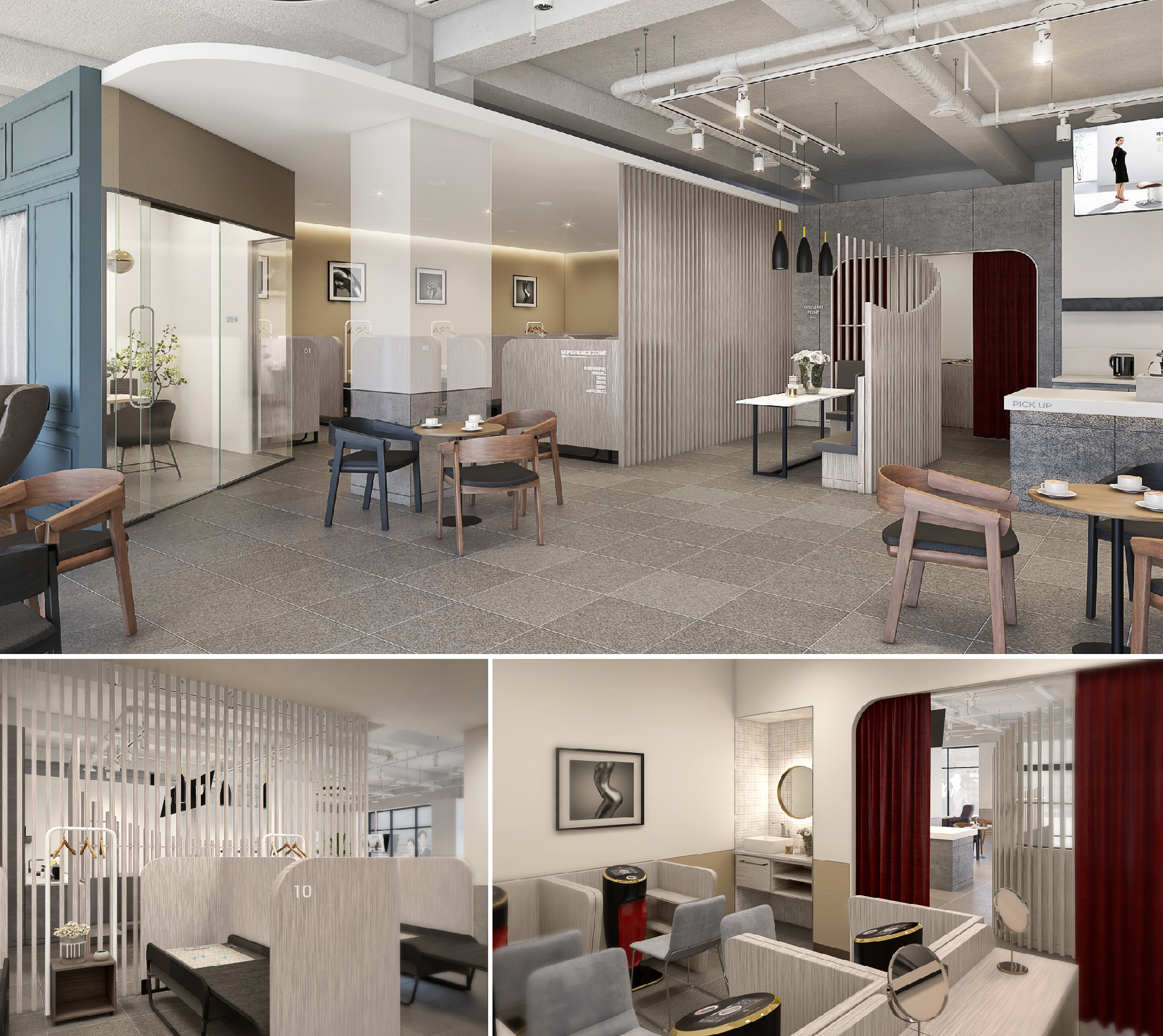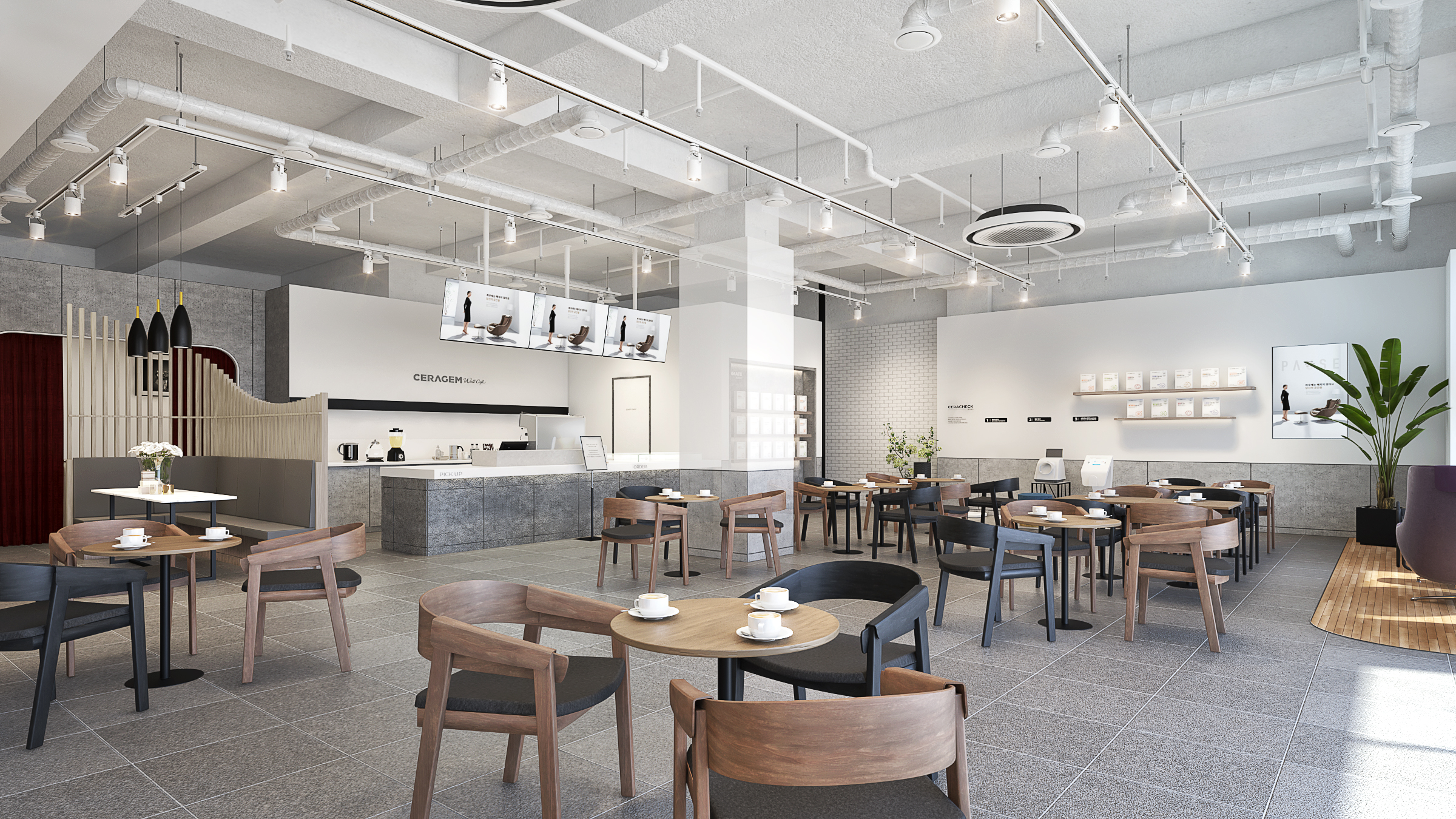세라젬 웰카페는 크게 4가지 존으로 구성됩니다. 각 공간은 제품에 따른 개별적 성격을 유지하면서 넓지 않은 공간이 고객의 중심에서 배치되어야 해 공간 조닝(Zonning) 단계에서의 디자인 기획 역량이 집중됐습니다.
