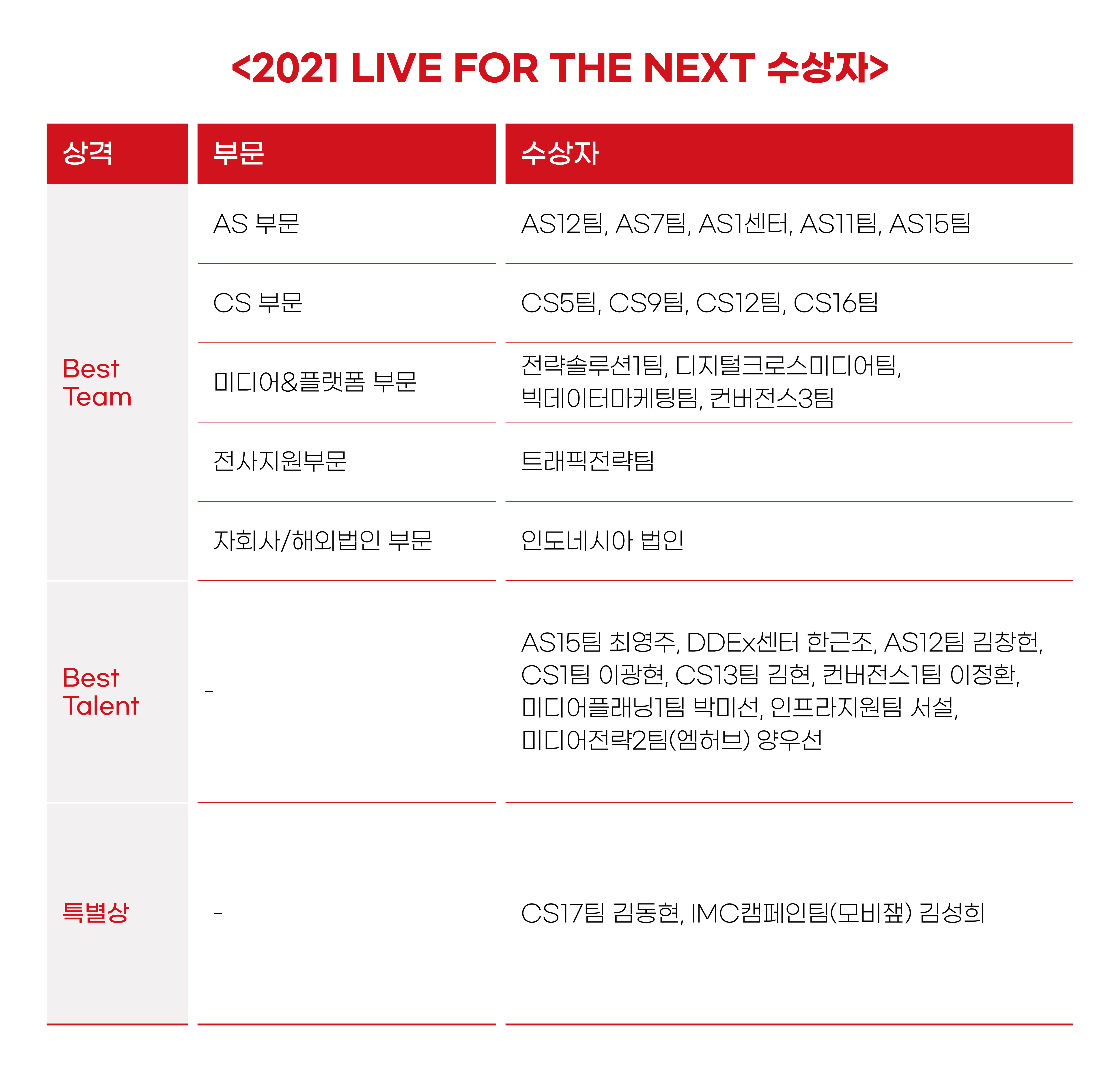 대홍기획이 1월 15일, 신축년 새해를 맞이하는 신년행사를 진행했다. 이번 행사는 코로나19로 인해 창사 이래 최초로 Youtube Live를 통해 비대면으로 실시됐다. 먼저 어느 해보다 힘들었던 2020년, 한마음으로 노력한 성과를 축하하는 <2021 L!VE FOR THE NEXT> 시상식으로 시작했다. Best Team, Best Talent, 특별상 3개 부문에 걸쳐 26개 팀 및 개인이 수상의 영광을 안았으며 수상자에게는 축하의 의미를 담은 상금이 지급됐다.