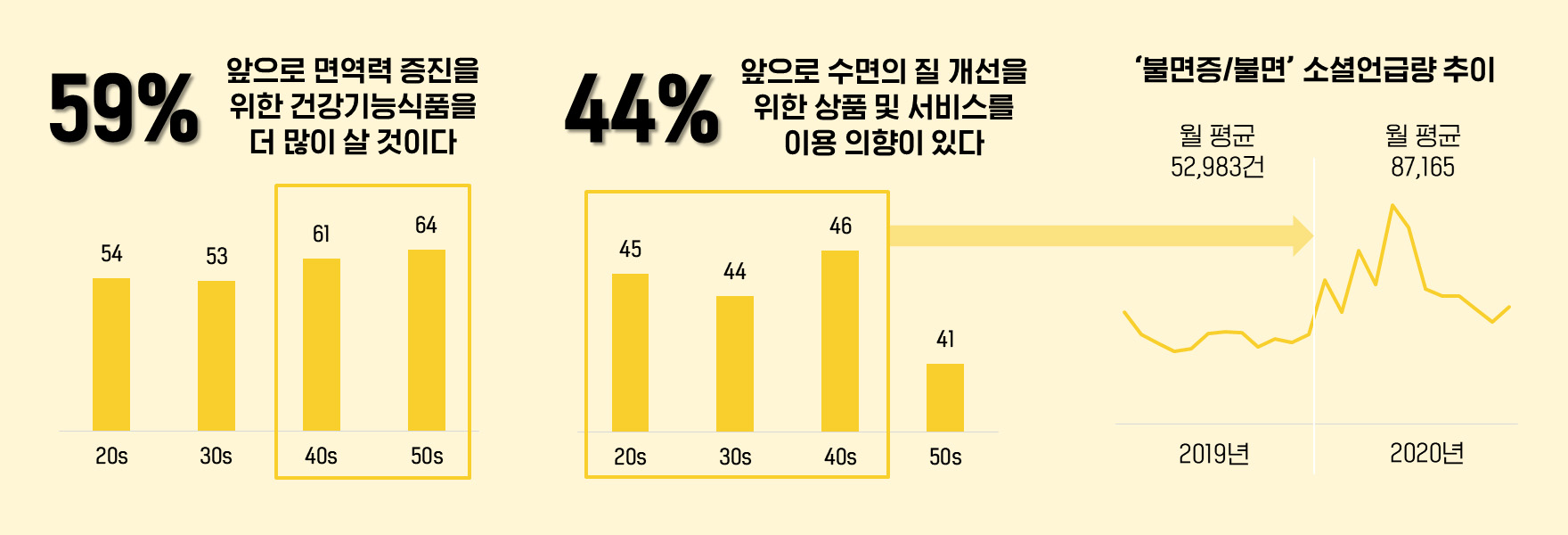 생존 불안에서 시작된 건강에 대한 관심은 위생과 면역 등 바이러스와 직접적으로 연관된 부분은 물론 의료, 건기식, 푸드, 뷰티를 넘어 멘탈케어에 이르기까지 다양한 수요와 서비스가 탄생하는 동력을 제공한다. 코로나 이후 심화된 건강에 대한 염려는 특히 40~50대에서 실질적인 구매 행동으로 연결될 전망이다. 반면 수면과 같이 스트레스나 정신적 건강과 유관한 영역에 대해서는 젊은층에 더욱 기회가 있을 것으로 보인다.