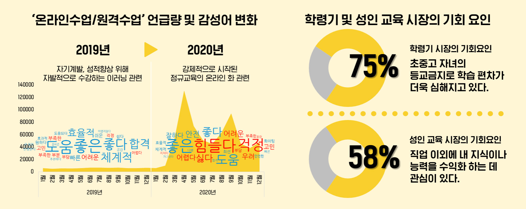 원격 교육은 교육의 사회적 기능 저하는 물론 수업의 질적 저하에 대한 우려를 고조시키고 있다. 뉴노멀을 대비한 성인 교육 수요 증가가 더해지면서 에듀테크 영역이 새로운 기회가 될 전망이다. 코로나 이후 정규교육의 준비되지 않은 온라인化는 교육소비자들의 불만과 고충의 원인이 되고 있다. 따라서 이로 인한 학습 효과 저하 및 편차에 대한 우려를 해소해줄 수 있는 상품이나 서비스가 각광받을 것으로 보인다. 특히 성인 교육 시장에서는 뉴노멀에 적응하고 남는 시간을 활용해 부가 수익을 거둘 수 있는 자기계발 영역에 기회가 엿보인다.