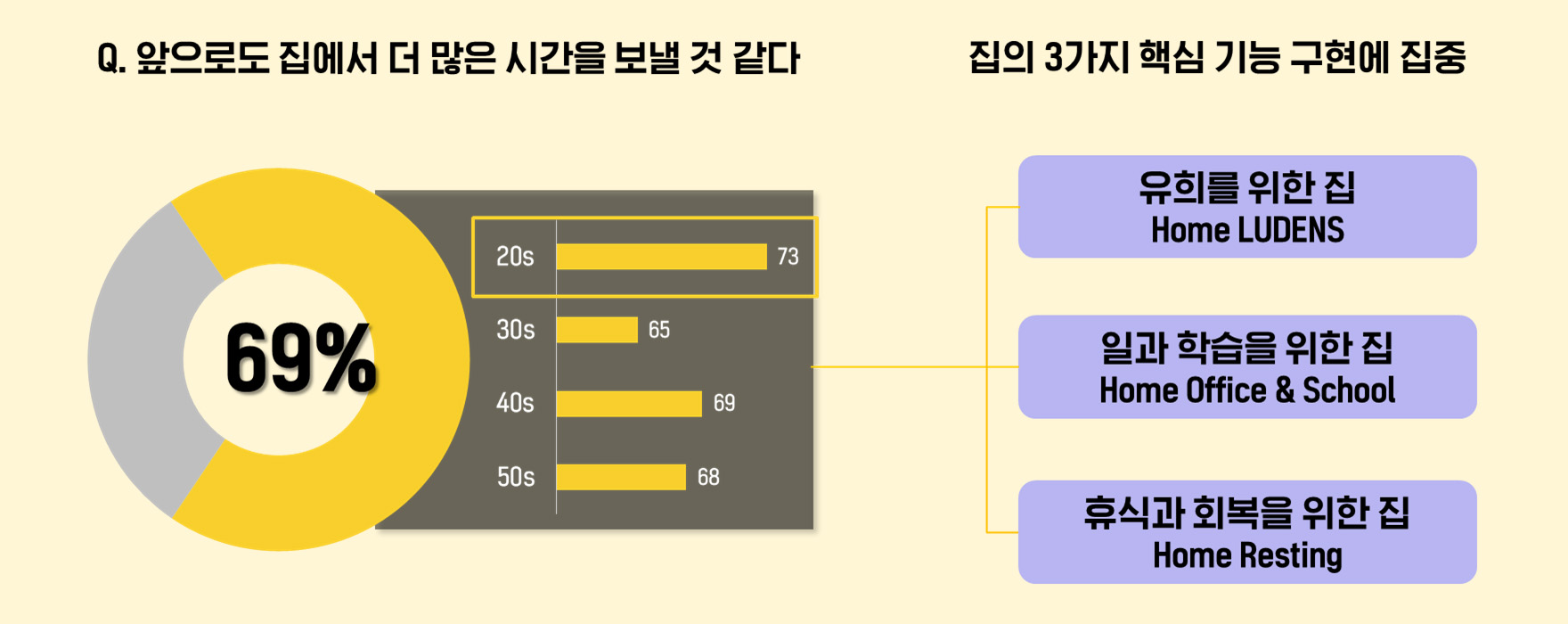 접촉, 모임의 제약과 재택근무로 시작된 AT HOME 라이프가 일상으로 고착되며 집의 3가지 핵심 기능을 효과적으로 구현해줄 상품과 서비스가 긴요해질 것이다. 집의 3가지 핵심 기능은 첫째, 유희를 위한 집(Home Ludens) 둘째, 일과 학습을 위한 집(Home Office & School) 셋째, 휴식과 회복을 위한 집(Home Resting)이다. 조사 결과에 따르면 10명 중 7명이 앞으로도 더 많은 시간을 집에서 보낼 것이라고 응답했으며 그 중에서도 20대가 가장 높은 비율을 보였다. 결국 집에서 시간을 ‘잘’ 보내기 위해 사람들은 집을 유희, 일과 학습, 휴식과 회복 기능을 갖춘 요새로 만들고자 한다.