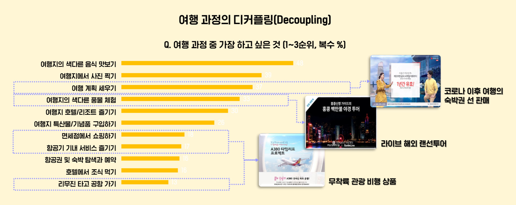 코로나19로 가장 큰 타격을 입은 산업이자 가장 억눌린 욕망은 단연 여행이다. 이에 대한 갈망이 새로운 서비스를 낳는 원동력이 되고 있다. 여행의 과정을 잘게 분리하고, 현재 가능한 것을 선별하여 제공하는 디커플링(Decoupling)을 통한 대안적 여행이 새로운 돌파구로 떠오르고 있다. 항공기 탑승과 면세 쇼핑만을 묶은 무착륙 관광상품의 등장이 그렇고, 최근 마이리얼트립을 통해 선보이는 라이브 해외 랜선투어 역시 좋은 사례다. 심지어 롯데홈쇼핑에서는 코로나 이후 ‘언젠가’를 위한 해외숙박상품 선판매 방송이 매진되는 진풍경이 연출됐다. 여행 관련 영역은 가장 억눌린 만큼 가장 다양한 변주가 나오고 있다.