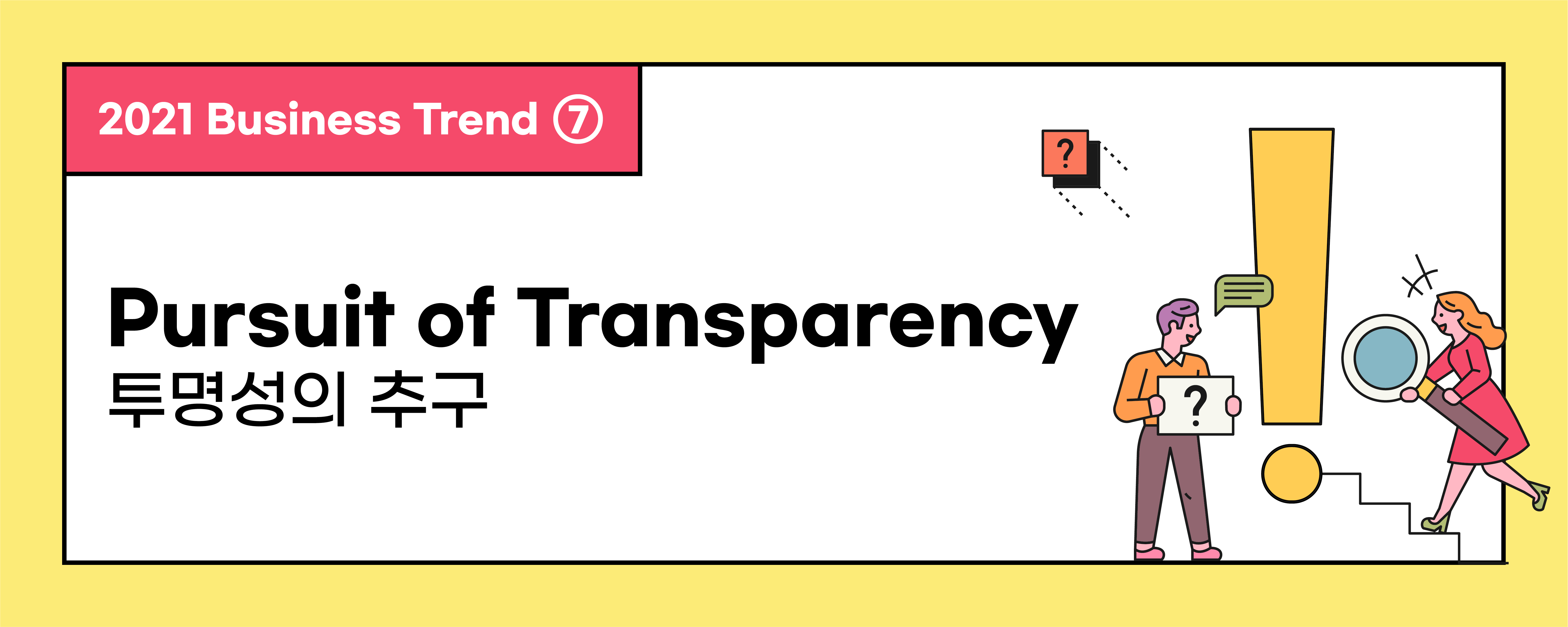 지금 사람들이 원하는 투명성이란 지속가능성과 공급망 투명성을 포괄하는 개념이다. 상품이 어디서 생산되어 어떻게 취급됐으며 어떤 경로로 왔는지 ‘명확히 알 수 있어야 한다’는 것이다. 생존의 불안에서 출발한 안전에 대한 욕망은 지구의 지속적인 안전을 확보하기 위한 지속가능성에 대한 요구와 눈에 보이지 않는 영역까지 명확히 확인하고자 하는 투명성의 추구로 귀결되고 있다. 이는 구체적으로 로컬 식재료에 대한 관심, 보이지 않는 것에 대한 확신을 심어줄 각종 인증마크의 중시, 생산과 유통 과정, 성분 등에 대한 관심이 높아지는 행태로 나타나고 있다.