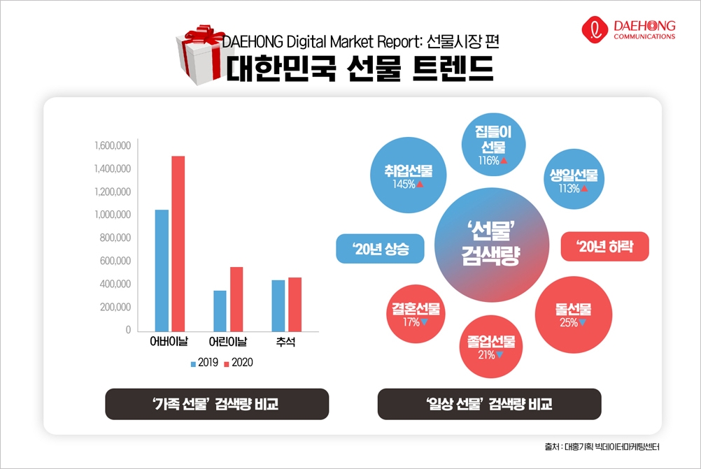 대홍기획 빅데이터마케팅센터에서 최근 3년간의 온라인 데이터를 분석한 결과, 지난해 선물 검색량은 재작년 대비 어린이날 155%, 어버이날 145%, 추석 106% 증가했다. 전통적으로 가족과 함께 보내는 명절 및 기념일에 모임 빈도가 줄어든 대신 선물을 준비하는 것으로 풀이된다. 또한 일상 속 행사를 축하하는 선물 검색량은 취업선물 145%, 집들이선물 116%, 생일선물 113% 등 전반적으로 상승한 반면 외부에서 진행되는 결혼식, 돌잔치, 졸업식 등이 대부분 취소되며 관련 선물 검색량도 줄어든 것으로 나타났다.