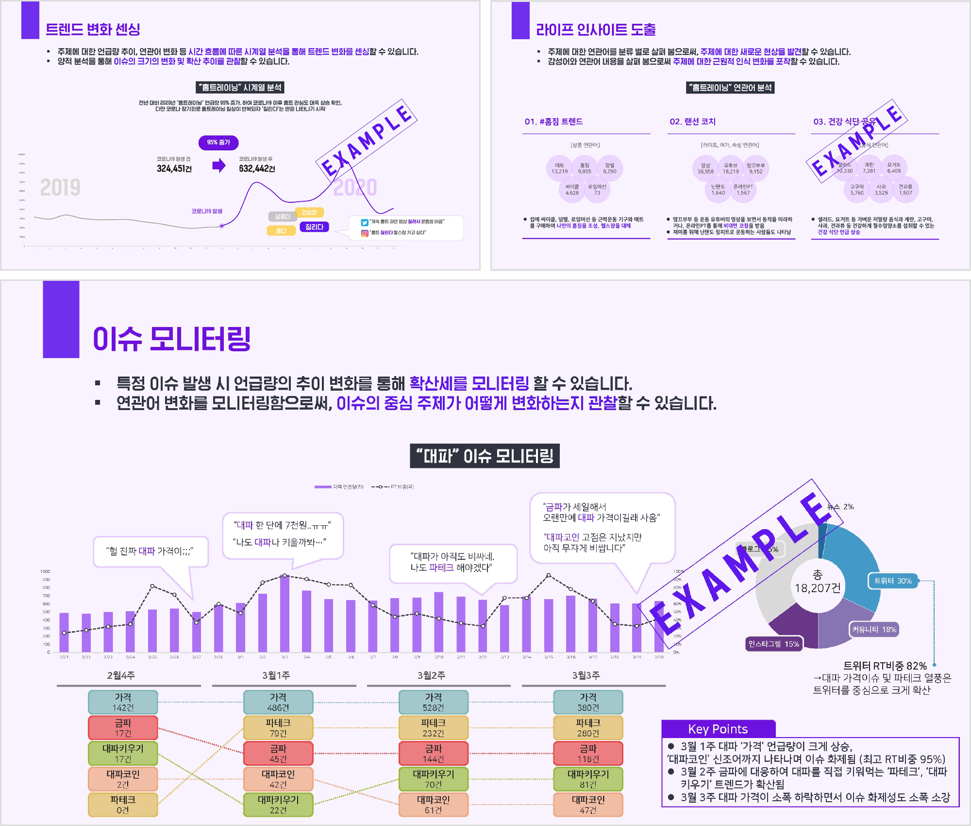 원래 텍스트 데이터는 대표적인 비정형 데이터로, 날것으로는 정량적 분석이 어렵다. 그러나 자연어 처리 기술을 통해 문장들을 어구, 단어, 형태소로 분해하고 분류체계(텍사노미)를 통해 가르거나 묶어주면 정량적으로도 정성적으로도 분석 가능하다. 요즘 흔히 사용하는 R이나 파이썬 등 도구를 가지고 무료로 공개된 분류체계를 활용해 개인적으로도 충분히 분석할 수 있지만, 안정적인 수집과 처리, 시각화를 원하며 사내에서 상시 활용되기를 원한다면 역시 전문적인 분석 솔루션을 사용하는 것이 좋다.