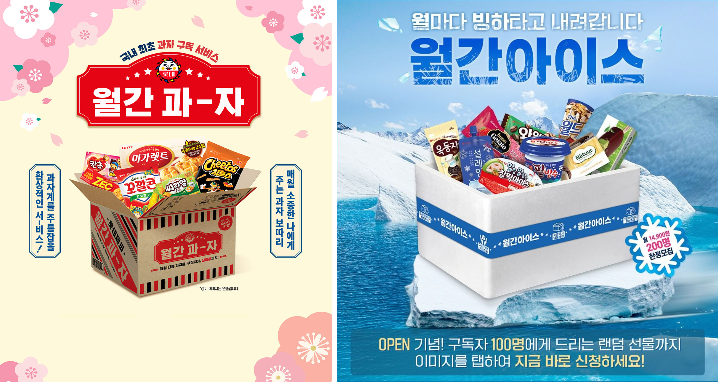새로운 서비스를 이야기하자면 구독 시스템도 빠질 수 없다. 구독 형태의 온라인 마케팅은 코로나 이전부터 움직임이 보이기 시작했다. 코로나 이전의 구독경제가 특정한 취향을 가진 특정 계층을 노린 마케팅이었다면, 현시대의 구독경제는 좀 더 광범위하고 일반적인 소비자를 노린다. 롯데제과의 ‘월간 과자’ ‘월간 아이스’의 경우 몰아치는 식품 마케팅의 세계에서 새로운 제품에 도전해보고 싶은 사람들을 위해 신제품과 기존 인기 제품들을 섞어 매달 제공해 호기심 많은 소비자에게 어필한다. GS25를 비롯한 편의점의 커피 구독 시스템은 편의점 커피를 구매하는 소비층이 꾸준히 있음을 파악하고, 지속적인 방문을 유도하기 위해 전략적으로 만들어져 효과를 톡톡히 보는 중이다.