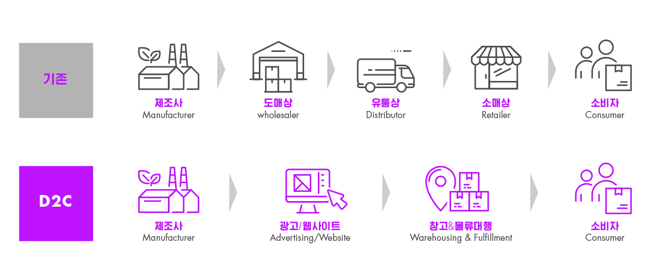 D2C의 인기 배경에는 디지털 생태계에 지각변동을 일으키는 ‘플랫폼’이 있다. D2C는 제조업체가 중간 유통상, 오프라인 매장, 온라인 플랫폼 등을 거치지 않고 바로 소비자에게 제품을 판매하는 방식이다. 이러한 프로세스가 가능한 것은 생산, 유통, 판매, 마케팅이 데이터를 기반으로 연결된 플랫폼 구조 덕분이다. 최근 D2C에서 D2M(Customer-to-Manufacturer)으로 진화하는 움직임까지 생겨났다. 이는 브랜드가 아닌 생산자(제조 공장)가 직접 고객과 컨택하며 소비자의 입맛대로 제작 및 판매하는 방식을 말한다. 기업이 고객과 점점 가까워지고 있는 것이다.