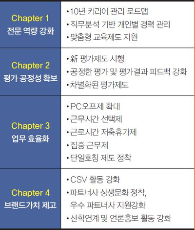 민수 가장 먼저 <1기>에서는 직원복지 강화와 워라밸 개선에 중점을 두었습니다. 광고회사가 워낙 업무 강도도 세고, 야근도 많아서 블랙컴퍼니라는 오명도 갖고 있잖아요. 이것을 없애기 위해 장기근속자 안식휴가제, PC-OFF제, 매월 셋째 주 금요일에는 오전 근무만 하는 Happy Friday 등을 도입했고, 직원들 만족도가 매우 높았습니다. 가장 구체적인 성과를 보인 부분인 것 같아요.