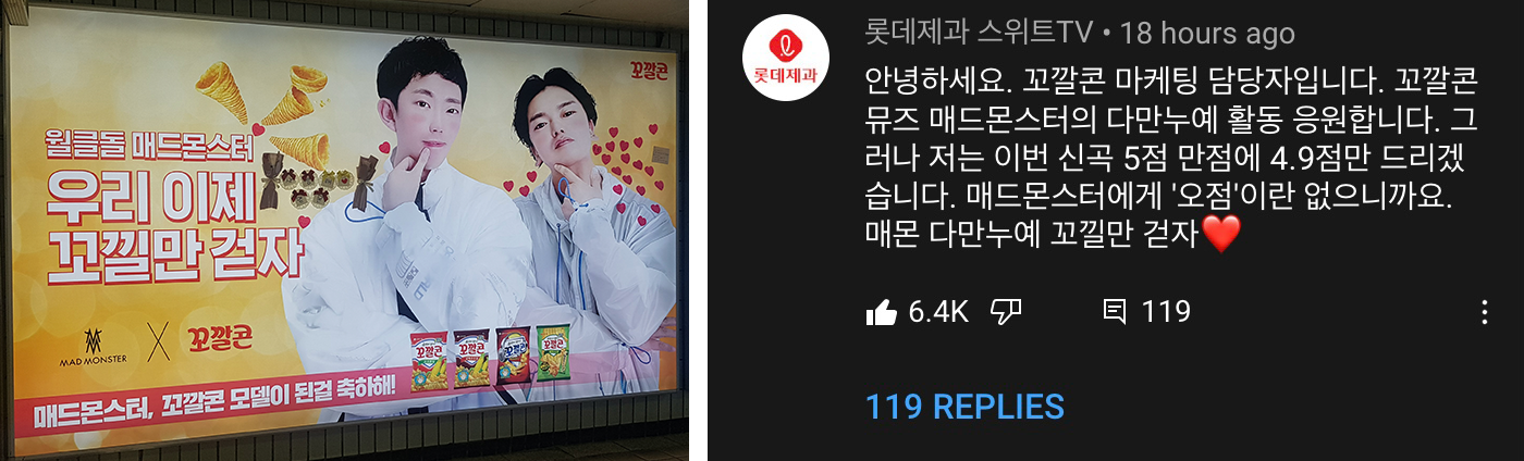 또, 7월 7일 유튜브에 공개된 매드몬스터의 신곡 <다시 만난 누난 예뻐> 영상에 롯데제과 브랜드 계정으로 댓글을 남겨 격한 반응을 불러일으켰습니다. 새로 고침 할 때마다 마케팅 담당자의 센스 칭찬은 물론, 성과급을 올려달라는 제 마음의 이야기를 대변해준 포몬 여러분의 많은 사랑에 너무나 행복한 캠페인이었습니다.