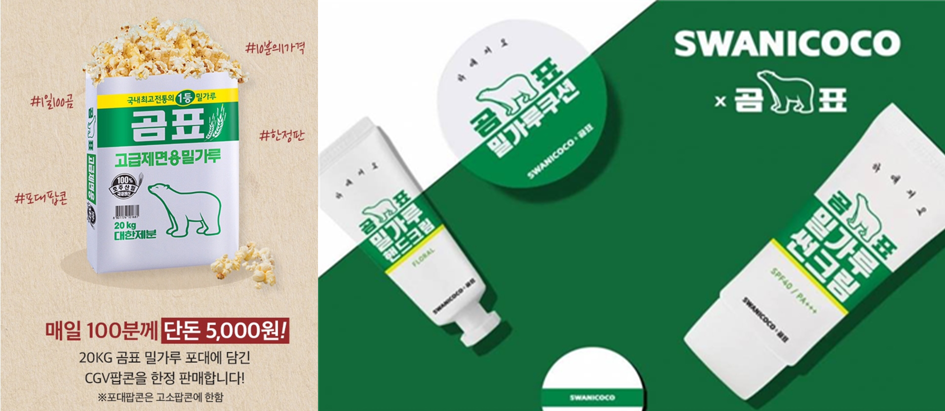 65년 장수 브랜드 곰표. B2B가 주력 사업이다 보니 오래됨, 고루함 등의 부정적 인식이 자리잡고 있었다. 브랜드 자체가 레트로인 곰표는 4050에게 추억을, 2030에게 새로움과 재미를 줄 수 있을 것이라 판단, 브랜드 재활성화를 위해 고객에게 ‘밀가루로 요리할 때의 즐거움’을 심어주고 ‘즐거운 요리 동반자’로 자리매김을 목표로 했다. 모든 콜라보레이션은 위트와 재미에 초점을 맞췄다. 화장품의 화이트닝 효과와 밀가루 제품 속성을 매칭한 밀가루 쿠션, 예상치 못한 사이즈의 밀가루 포대에 CGV 팝콘을 담아 반전의 재미를 제공했다. 소비자의 바이럴은 폭발적이었고 매진 열풍이었다. 세븐브로이와 출시한 밀맥주는 3일만에 10만캔을 판매하는 기록을 세웠다. 누군가에게 단순히 추억으로 머물러 있던 브랜드가 콜라보레이션을 통해 새로운 고객의 주목을 끌었고 결과적으로 브랜드 인지도와 호감도를 상승시켰다.