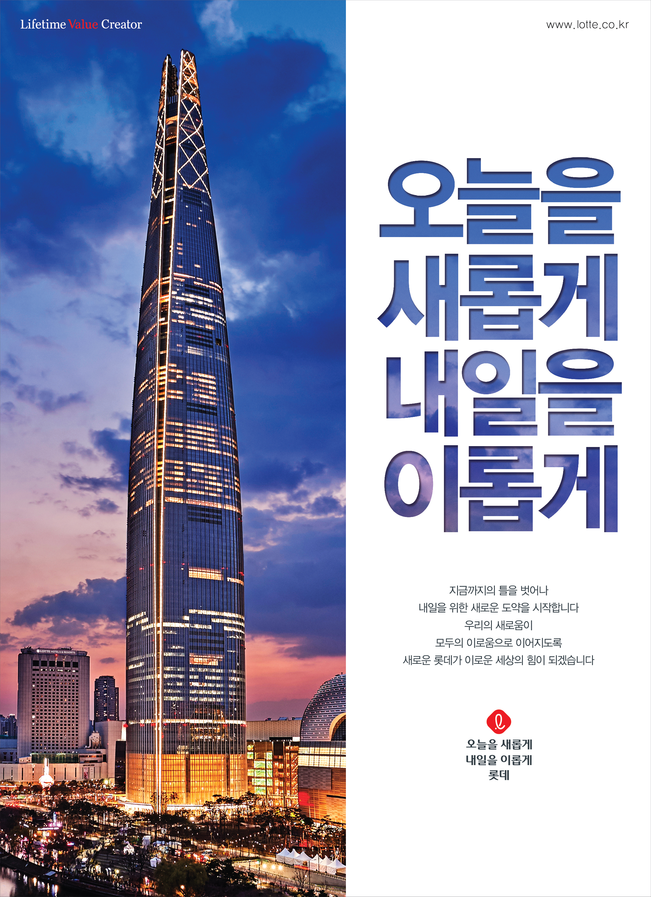 롯데그룹이 새롭게 나아가는 변화와 혁신의 의지를 표명한 ‘오새내이’ 슬로건의 첫 광고. 그룹이 나아가고자 하는 모습을 잘 표현한 광고를 통해 롯데그룹을 바라보는 시각에도 많은 변화가 있기를 기원합니다. 나아가 미래 생활 인프라 전반에서 ‘오늘을 새롭게 내일을 이롭게’ 대한민국의 미래를 바꿔나가는 롯데그룹의 발걸음에 앞으로도 많은 관심이 이어지기를 기대하고 염원합니다!