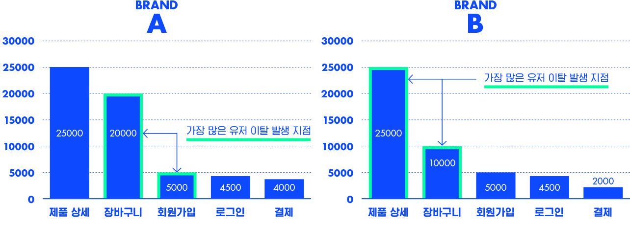 이런 식으로 퍼널 전략을 수립했다면 퍼널 단계별 KPI 분석을 통해 고객이 이탈하는 지점과 원인을 파악해 개선 포인트를 찾아낼 수 있다. 예를 들어 신규 가입자의 전환율을 높이는 목표를 가진 두 브랜드 A, B가 있다고 가정하자(두 브랜드는 산업군, 가격대, 브랜드 인지도에 차이가 없음). 두 브랜드의 퍼널 분석에서 A브랜드는 ‘장바구니 - 회원가입’의 단계에서 가장 많은 유저가 이탈한 반면 B브랜드는 ‘제품 상세 페이지 - 장바구니’의 단계에서 많은 유저 이탈이 발생했다. 이를 통해 A브랜드는 <회원가입> 단계, B브랜드는 <장바구니> 단계에 개선이 필요함을 확인할 수 있다.