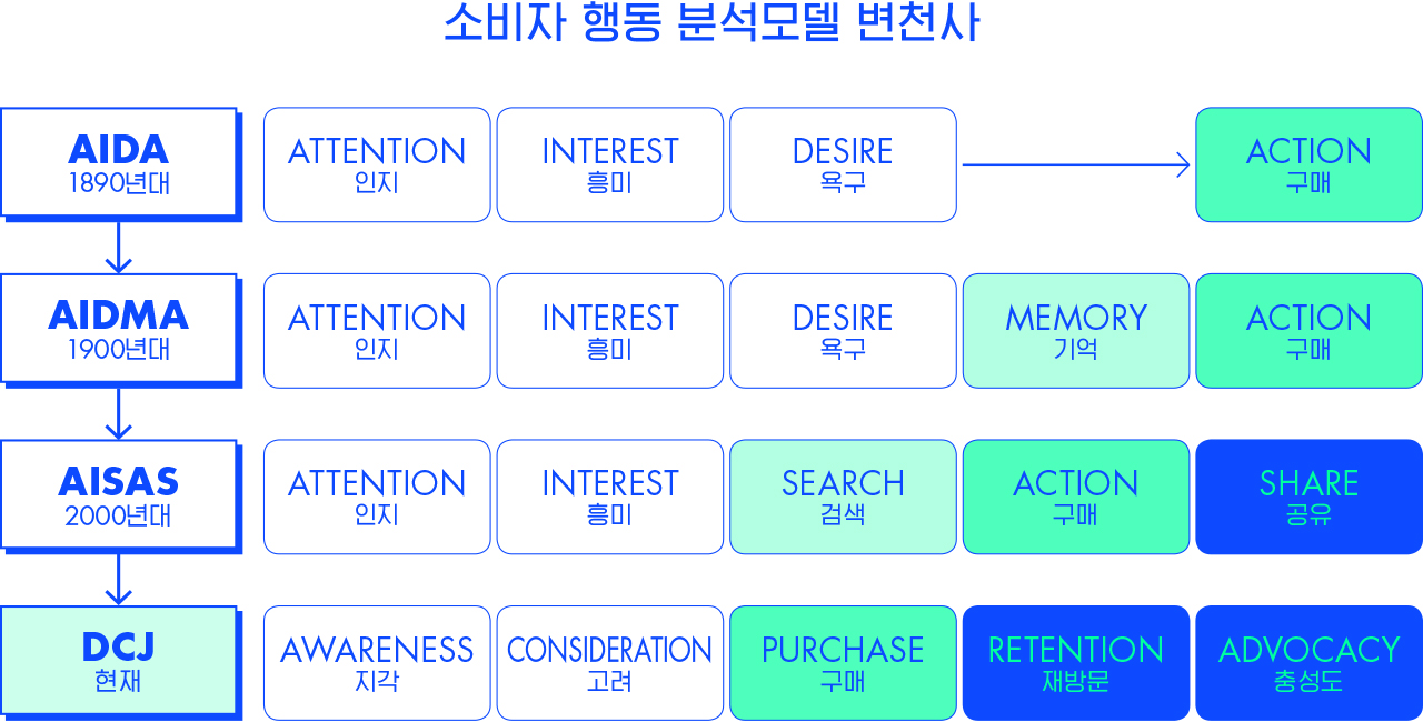 구매까지 이르는 고객 행동을 이해하기 위해 많은 분석모델이 사용되어 왔다. 전통적인 AIDA(Attention주목-Interest흥미-Desire욕구-Action행동)와 AIDMA(Attention주목-Interest흥미-Desire욕구-Memory기억-Action행동) 이후 2000년대 인터넷이 활성화되며 Search(검색)와 Share(공유)의 역할이 부각되어 AISAS(주의-관심-검색-행동-공유)가 널리 활용됐다. 최근에는 급성장한 모바일의 영향으로 DCJ(Digital Customer Journey)라는 새로운 방식의 구조화가 이뤄지고 있다. 다양한 분석 모델 변천사에서 볼 수 있듯이 소비자가 구매에 이르기까지의 행동을 이해하는 것은 모든 시대의 마케팅을 통틀어 가장 관심이 집중된 영역이다.