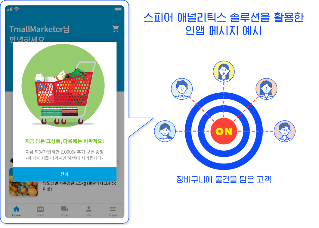 특정 단계에 머물러 구매를 향해 더 나아가지 않는 유저들의 이탈을 사전에 방지하는 마케팅 전략이다. 장바구니와 로그인 사이에 구매를 방해하는 허들을 발견한 경우 장바구니에 물건을 담은 고객들의 앱에 ‘장바구니에 담은 이 상품, 가입하면 2,000원 추가 할인!’과 같은 In-App 혜택 메시지를 띄워 해당 부분의 문제를 해결해 전환을 높일 수 있다.